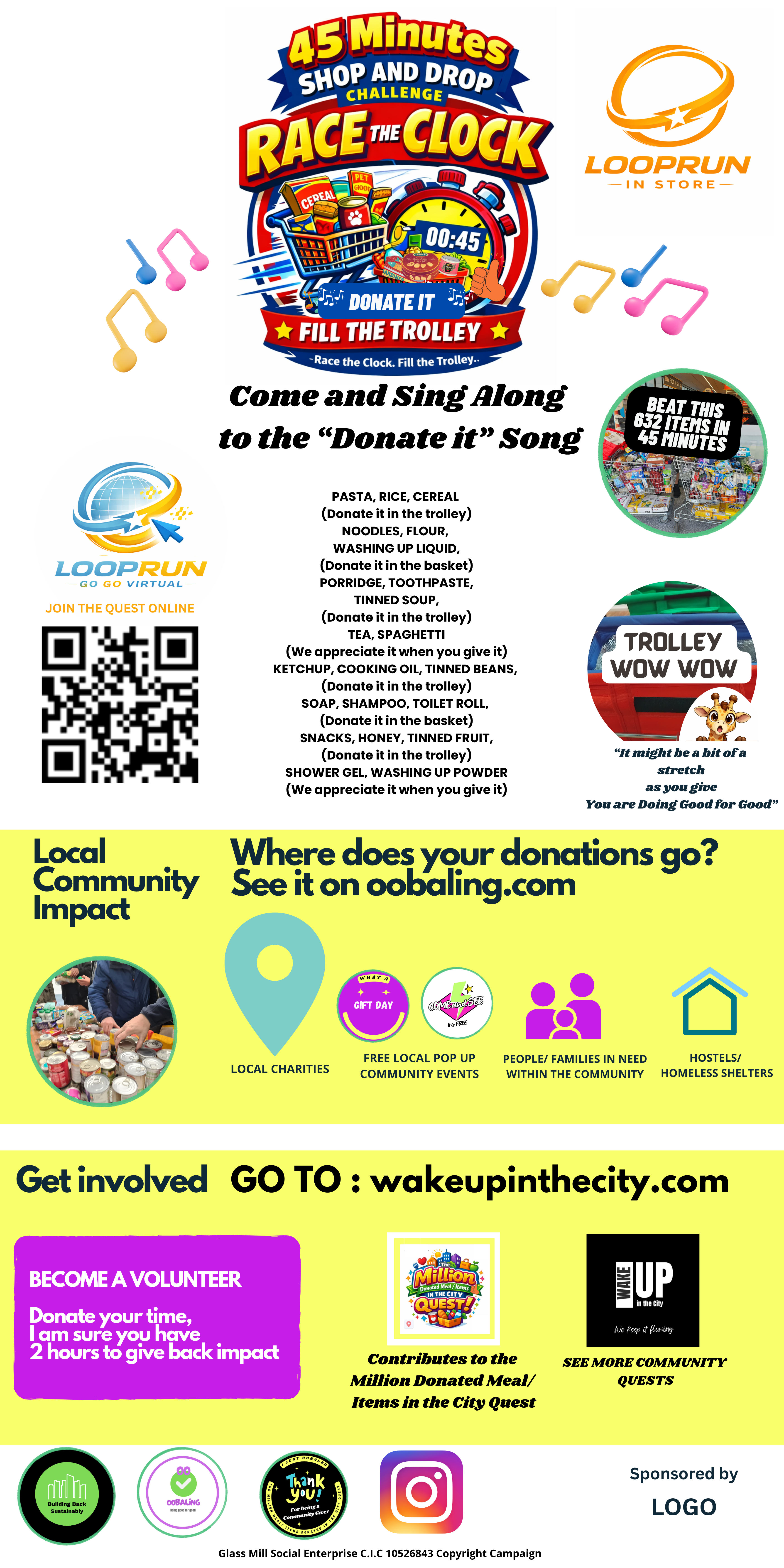 An event held outside the front of the store. In 45 minutes customers shop, buy and drop donations on the way out. A copyright campaign with a catch song " Donate it"